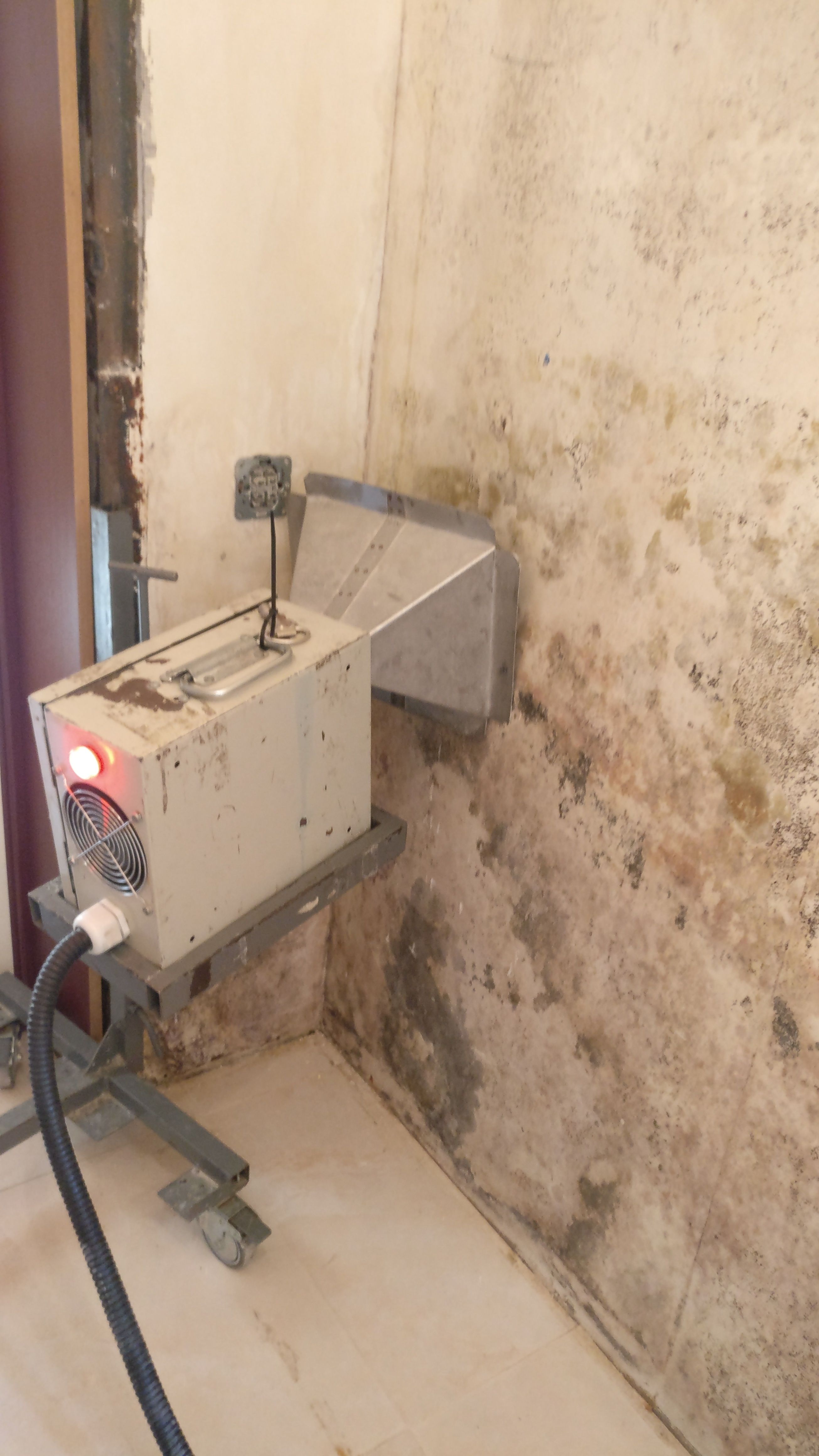Так же как плесень любит сырость и влагу, так же она ненавидит тепло и сухость. Идеальный метод обработки любых поверхностей от плесени это СВЧ. Материал прогревается участками 50*50 до температуры 65-70 градусов буквально за несколько минут на глубину 25-35 см. Грибница плесени не выдерживает таких температур и полностью погибает. Наши специалисты используют лазерные пирометры для точного определения температуры нагреваемой поверхности так как споры плесени спокойно чувствуют себя при температуре до 60 градусов. Это просто необходимо контролировать. Измерение температуры обычным термометром не подойдет так как необходимо учитывать коэффициент теплоотдачи каждого материала в отдельности для точного измерения. В домашних условиях — это практически невозможно без необходимого оборудования